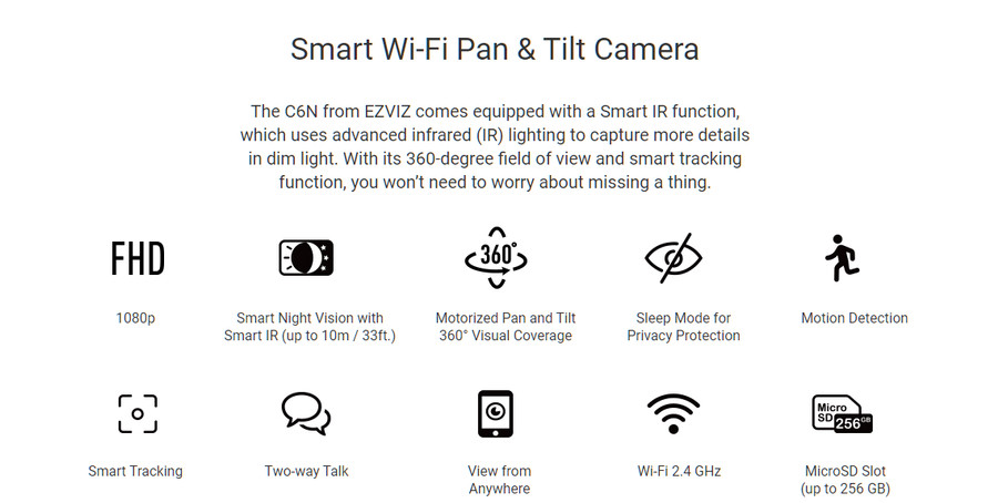 Packaging Contents : C6N camera; Base; Screw Kit; Power Cable 3m (9.8 ft.); Drill Template; Power Adapter; Quick Start Guide