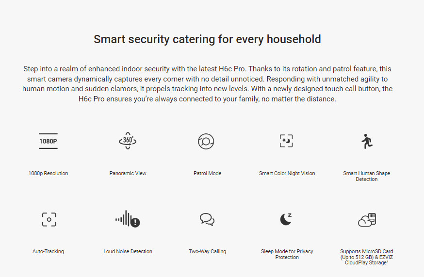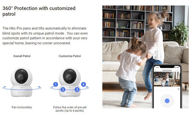 Smart Alarm: Motion detection, Human Detection, Human Tracking, Big Noise Detection, Auto patrol
